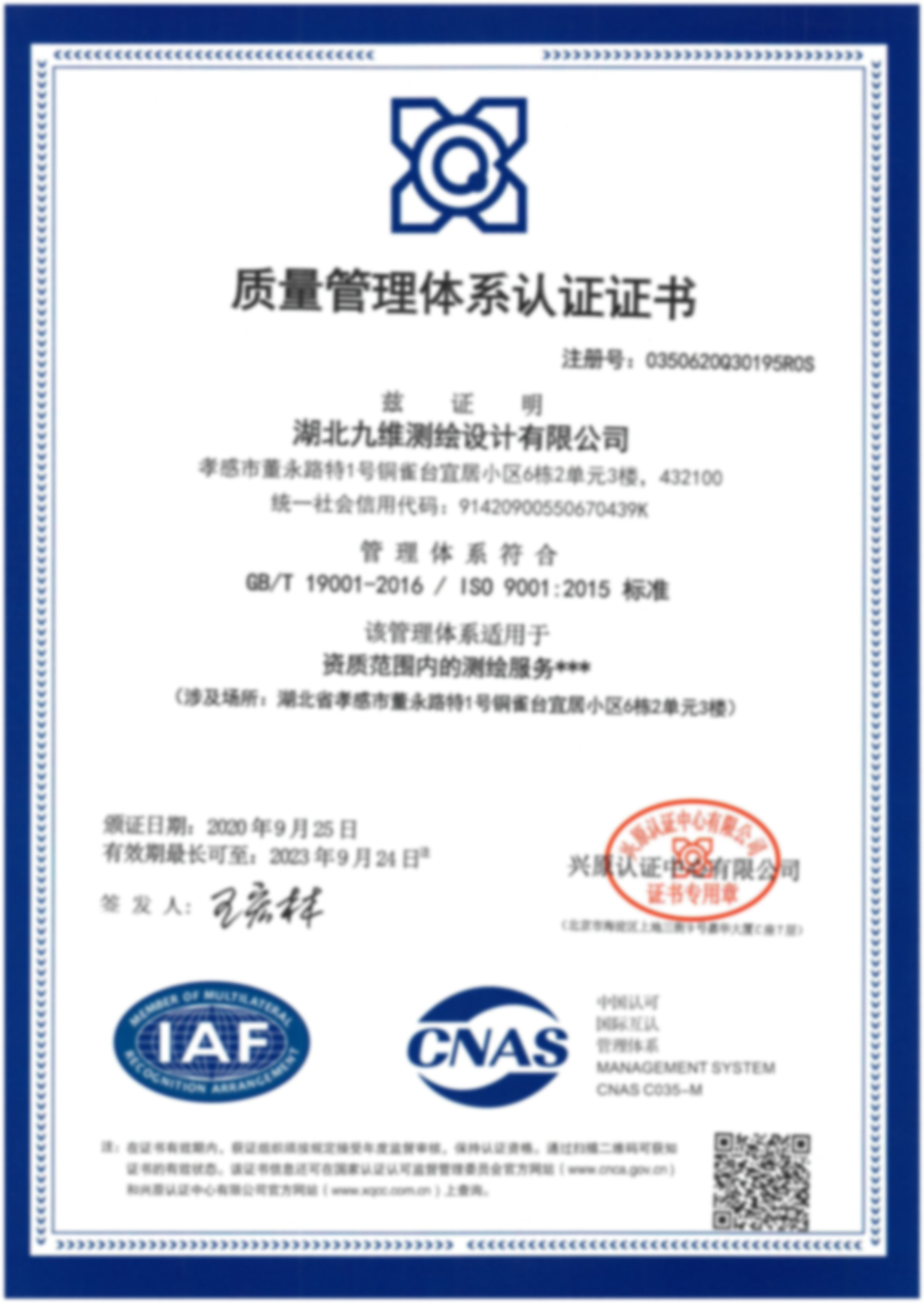 质量管理体系认证证书